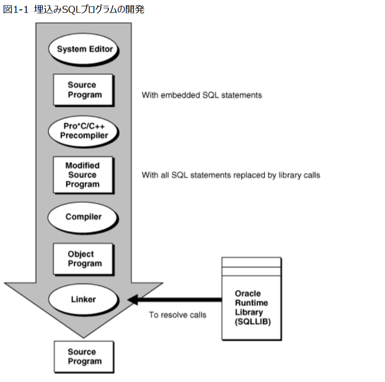 Oracleプリコンパイラとは、高水準ソース・プログラムで埋込みSQL文を使用可能にするプログラミング・ツールです。図1-1のように、プリコンパイラはソース・プログラムを入力として受け入れ、埋込みSQL文を標準Oracleランタイム・ライブラリ・コールに変換して、通常の方法でコンパイル、リンクおよび実行できる変更済ソース・プログラムを生成します。